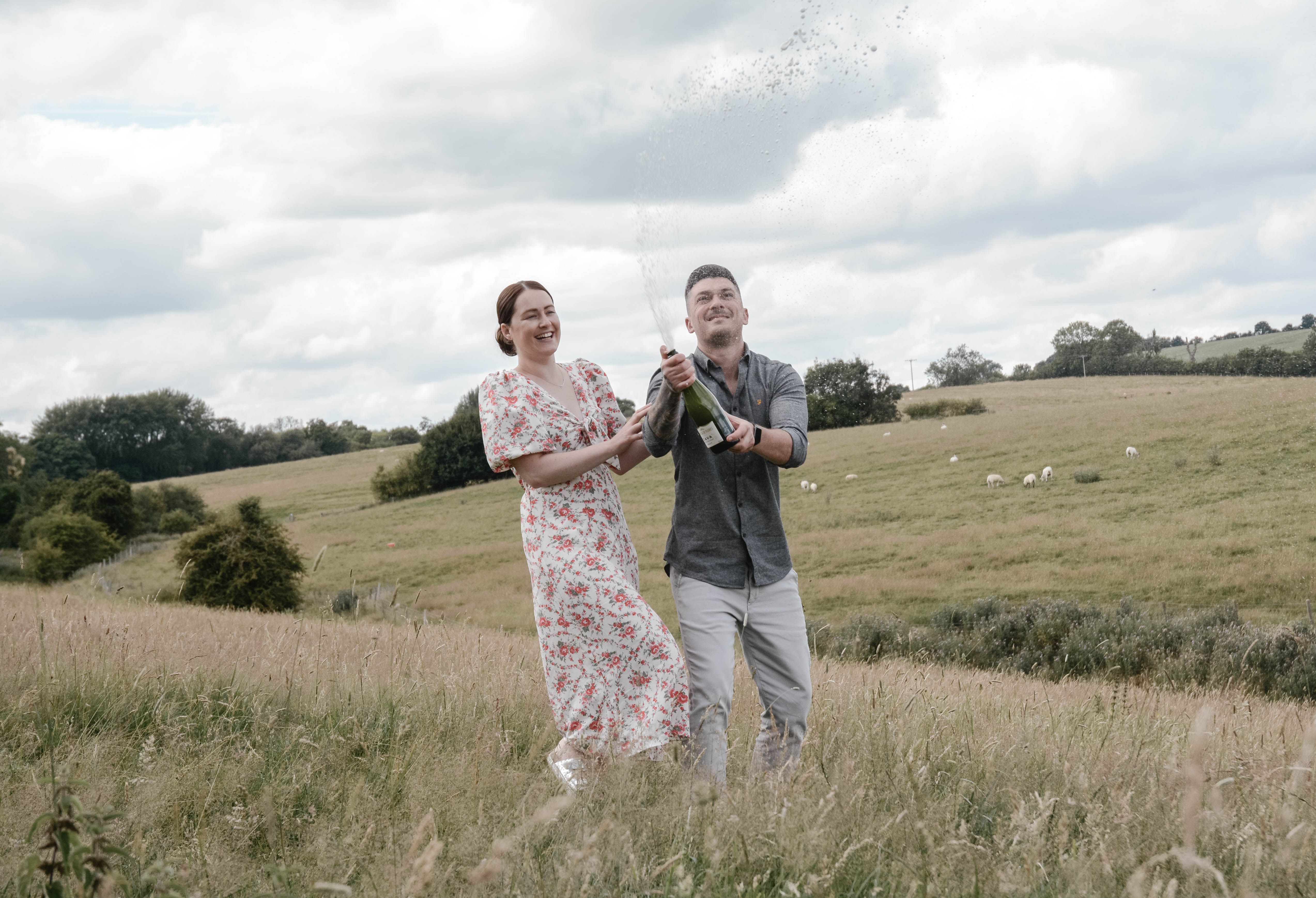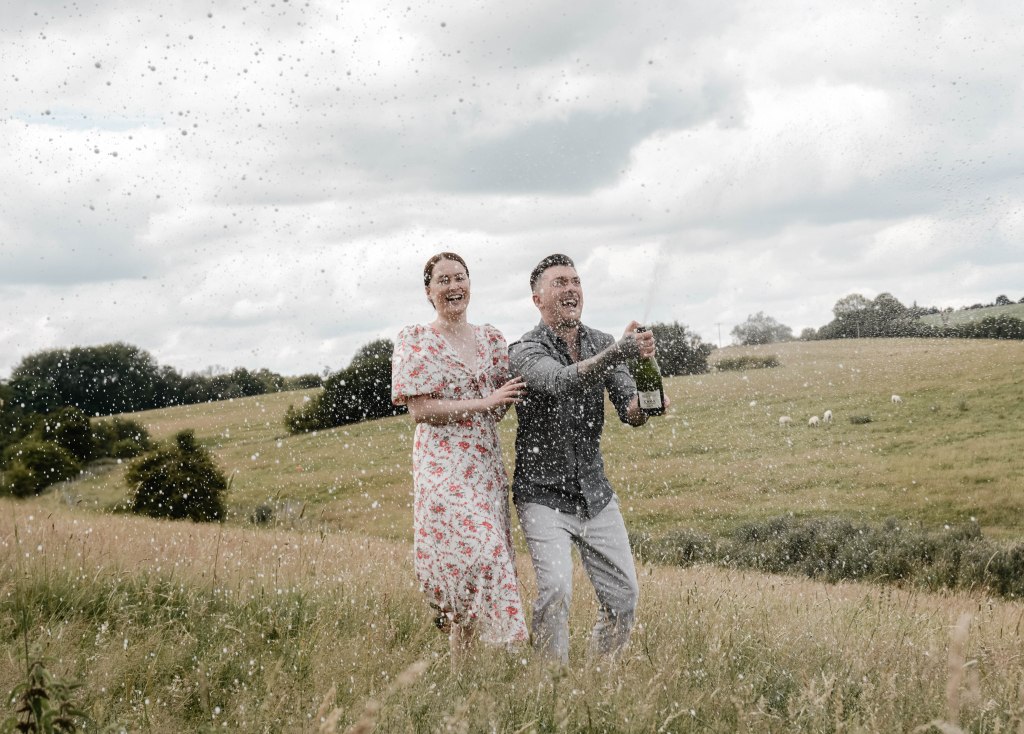 To finish the session , we walked up onto the hill over looking the whole estate . I love to bring a bottle of bubbly to spray – not only is it fun to do . But it gives a fun element to the photos . Aswel as an extra way of celebrating you both and the upcoming wedding .