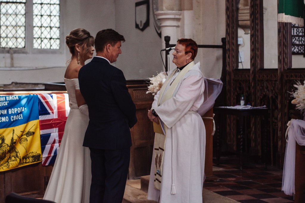 The bride is Ukrainian, and a special blessing was held for her country, with a Ukrainian flag placed within the church. It was a deeply emotional and meaningful moment for everyone present.
