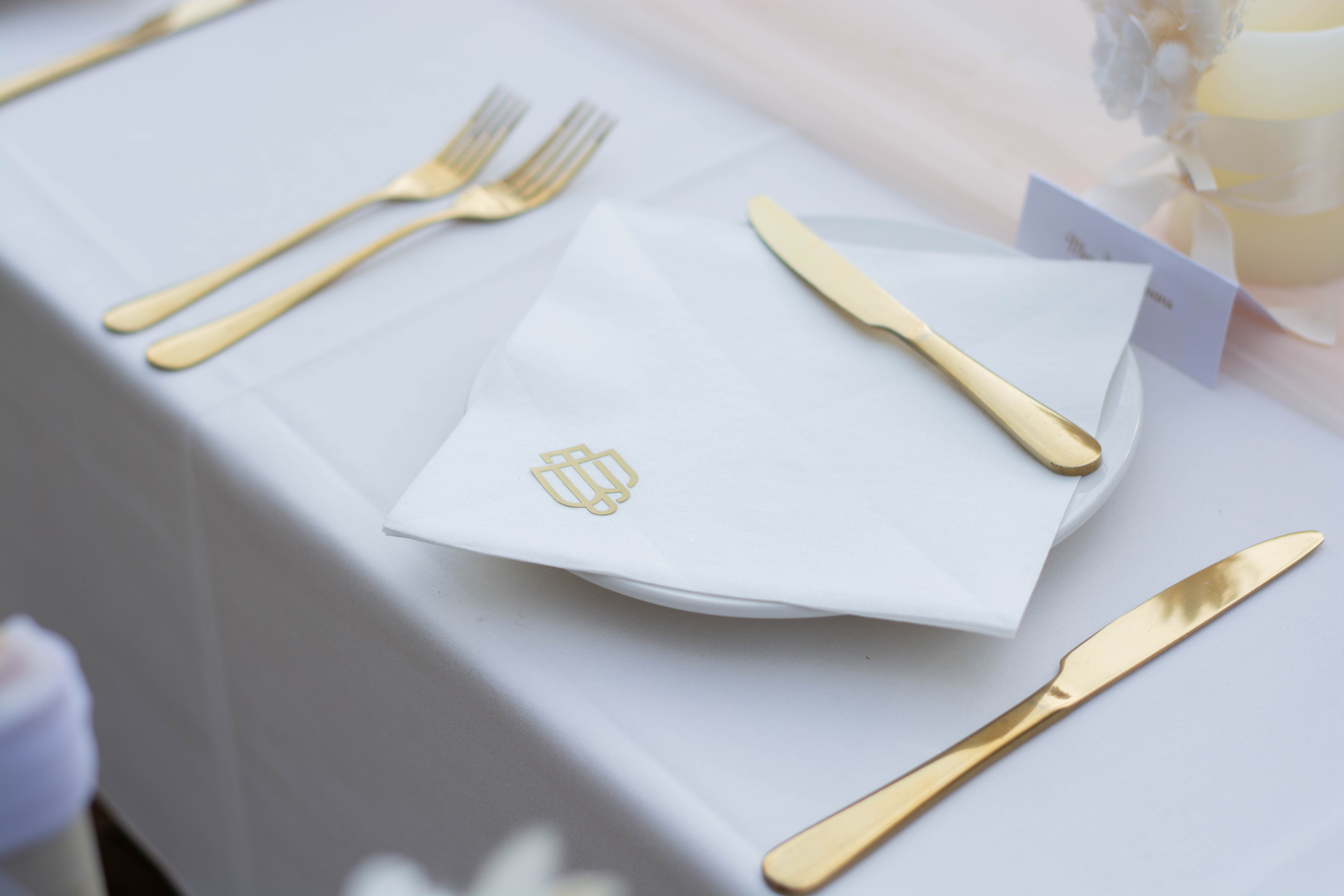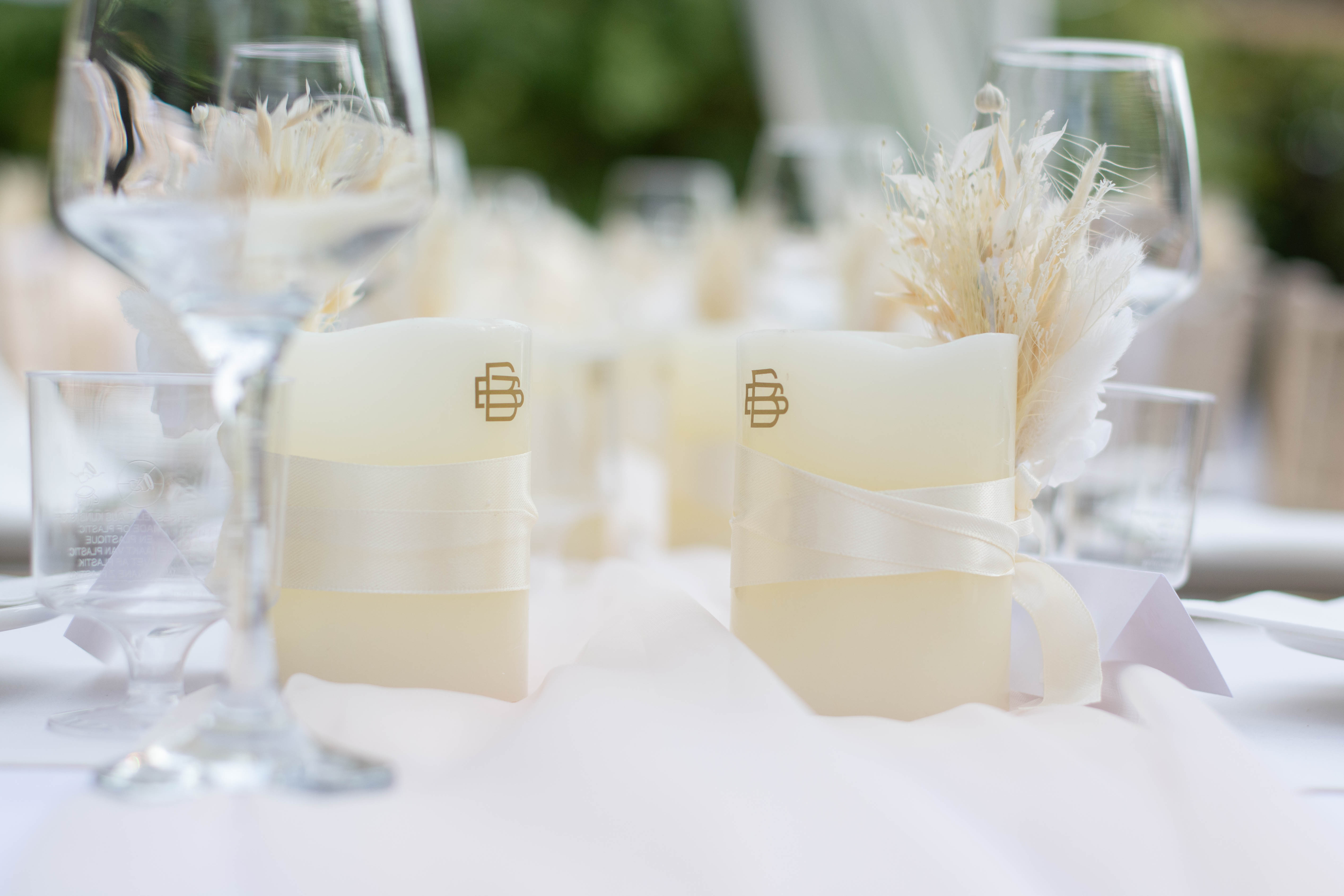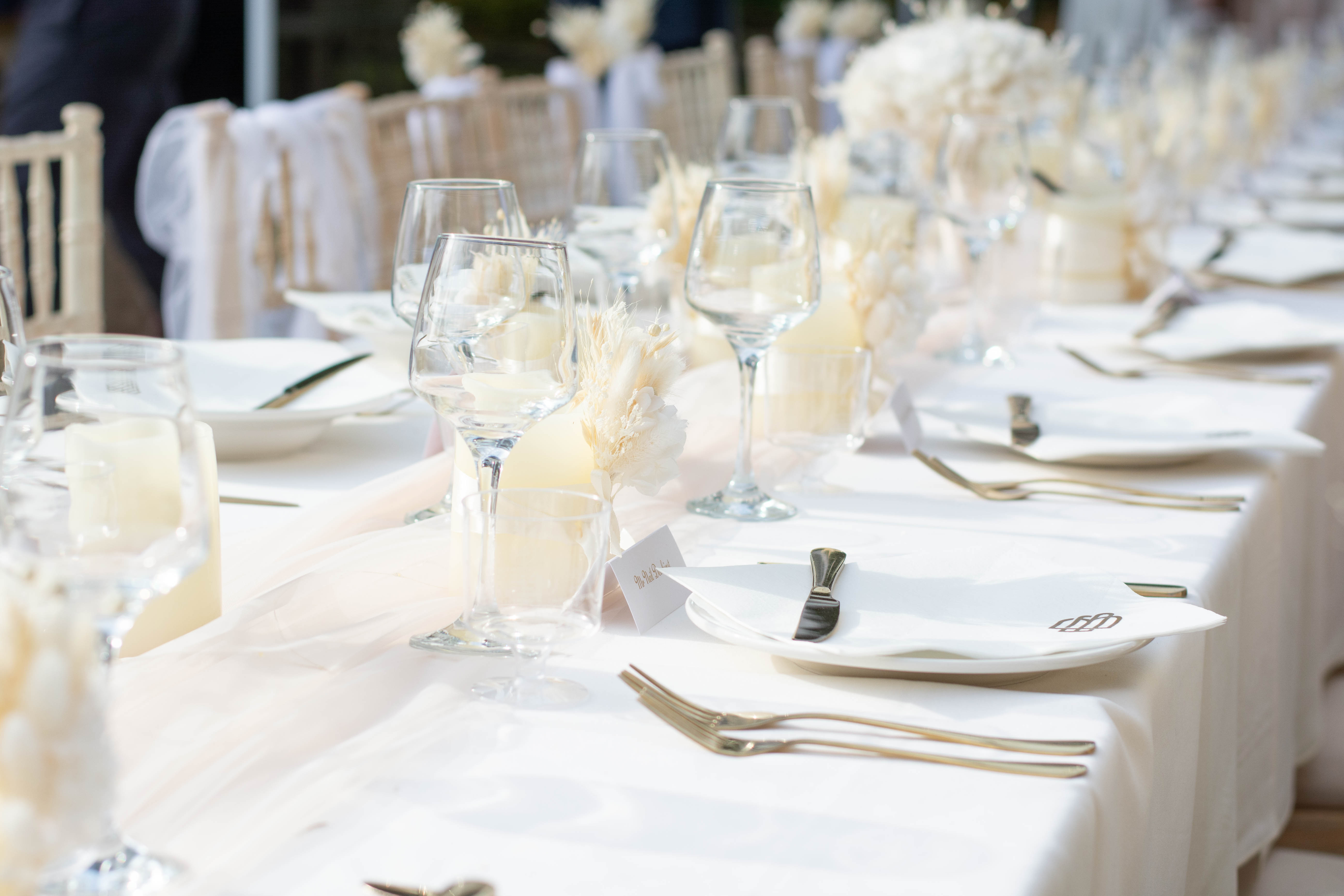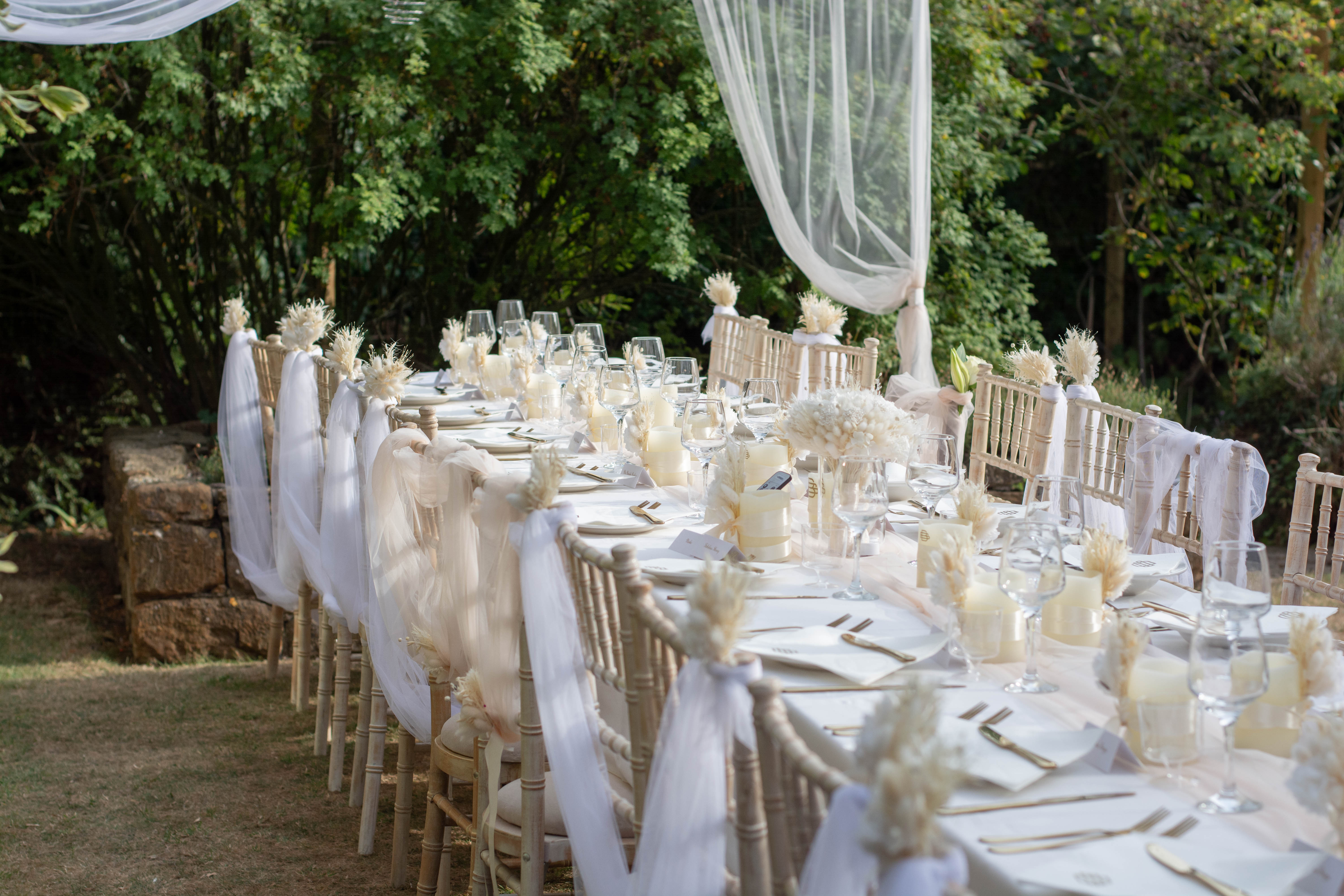 After the ceremony, we travelled to a gorgeous house the couple had rented in Northamptonshire. The bride had styled an outdoor dining table in the most beautiful English cottage garden, surrounded by flowers. The table décor was thoughtfully inspired by the business the couple run together in France, with everything adorned in their logo using a luxury gold motif. Pampas grass, neutral tones, and soft whites sat perfectly against the greenery and florals, while draped voiles and fairy lights hung above — looking especially magical as the evening drew in.